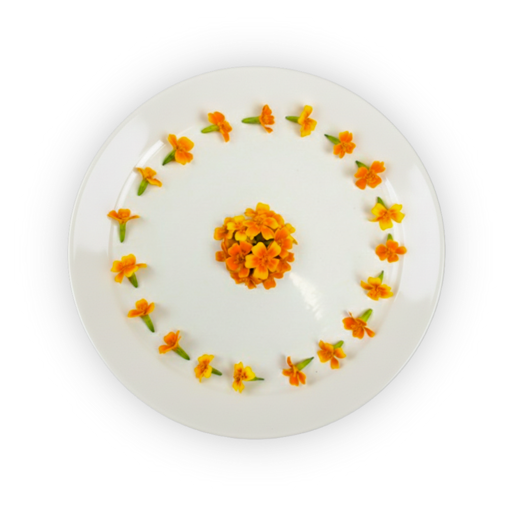 Bright orange and yellow micro flowers (0.5 inches), citrusy and lemony flavor. Their beautiful colors and citrus flavor pair well with ice cream, cocktails, seafood and salads.